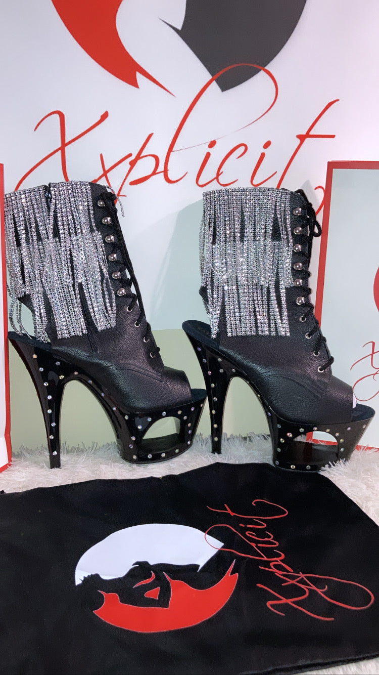Custom black ankle boots with rhinestone tassels